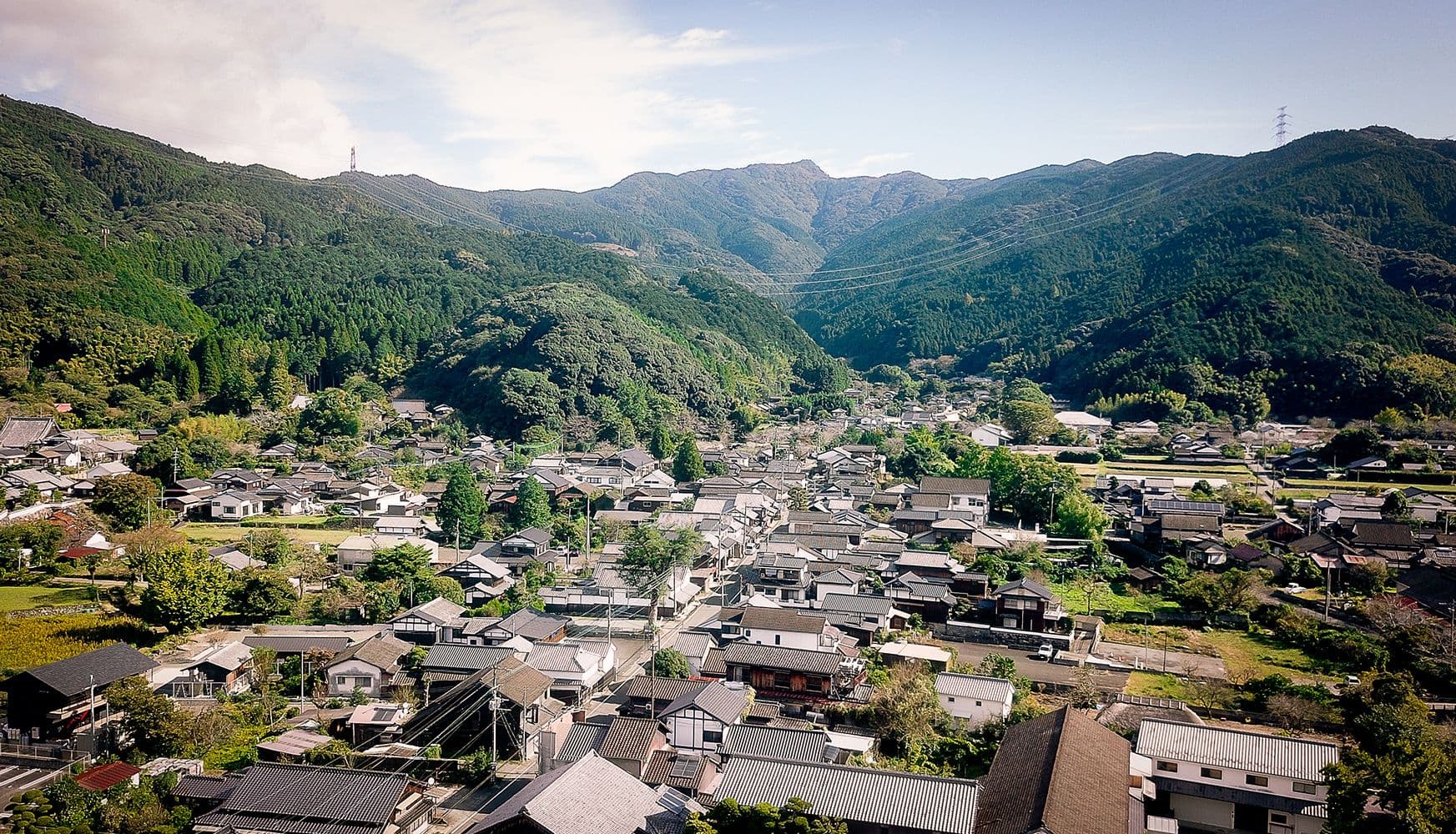秋月は朝倉市の北部、標高約860mの古処山の麓に広がる静かな町です。三方を山に囲まれ、南に開けた盆地に位置しており、周囲の自然と調和した美しい景観が広がっています。町の面積は約1000haで、その80%を山林が占めています。地理的に守りやすい場所であることから、歴史も深く、筑前の小京都とも呼ばれています。