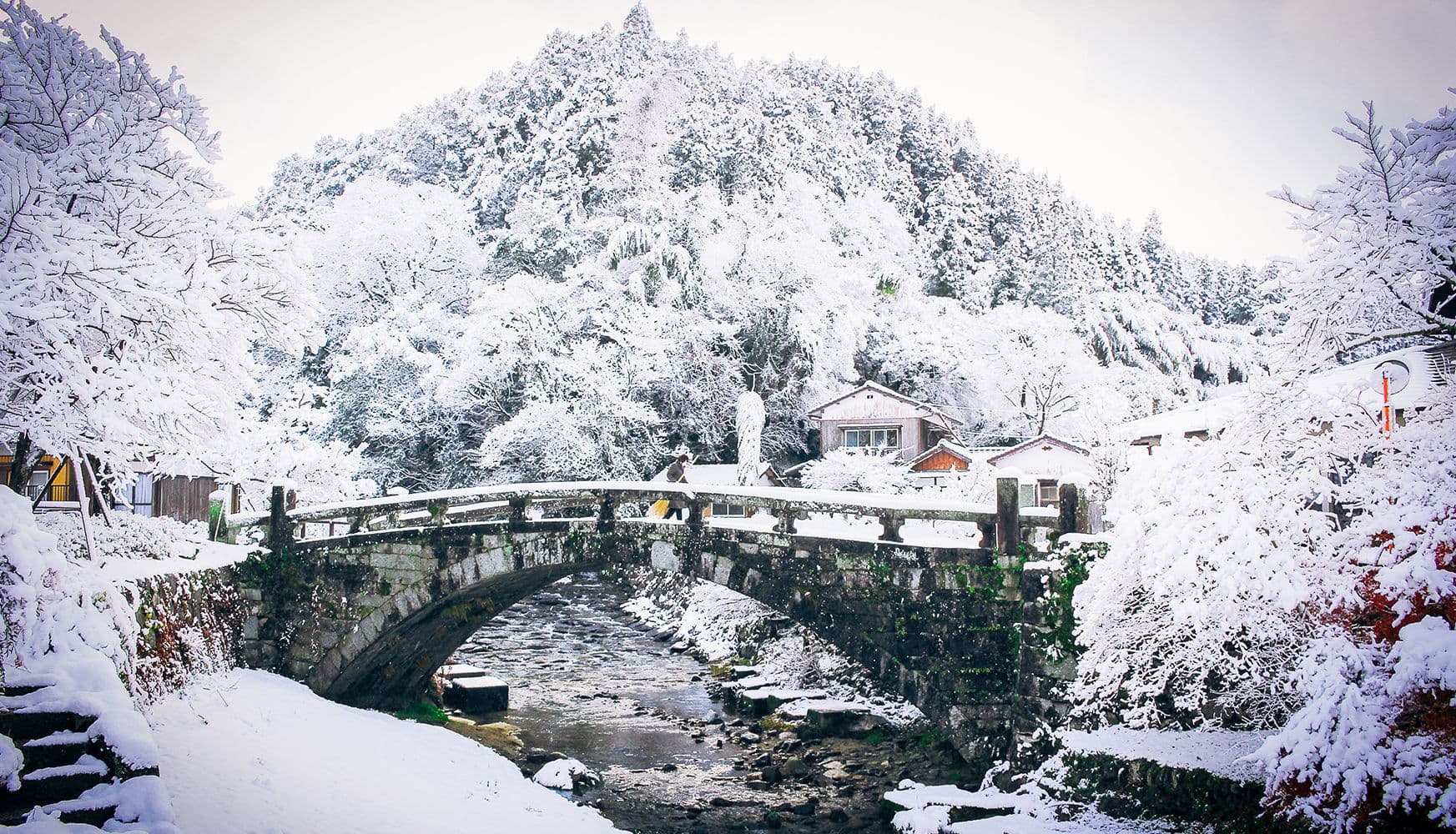 現在、秋月城下町には、上流から順に皐月橋、野鳥橋、秋月橋、秀都橋、今小路橋、目鏡橋の6つの橋があります。そのうち、旧来の位置を保っているのは、野鳥橋から目鏡橋までの5つの橋です。特に、1810年に当時の郡奉行のもと、長崎から招かれた石工たちによって築かれた眼鏡橋は、秋月のシンボルとなっており、福岡県指定の文化財にも指定されています。眼鏡橋は、秋月で採取される堅固な花崗岩を使って建てられており、そのスマートで繊細なデザインが特徴です。通常、花崗岩で作られる橋は桁橋が一般的ですが、眼鏡橋は大きなスパンを持ち、優雅な形状が際立っています。